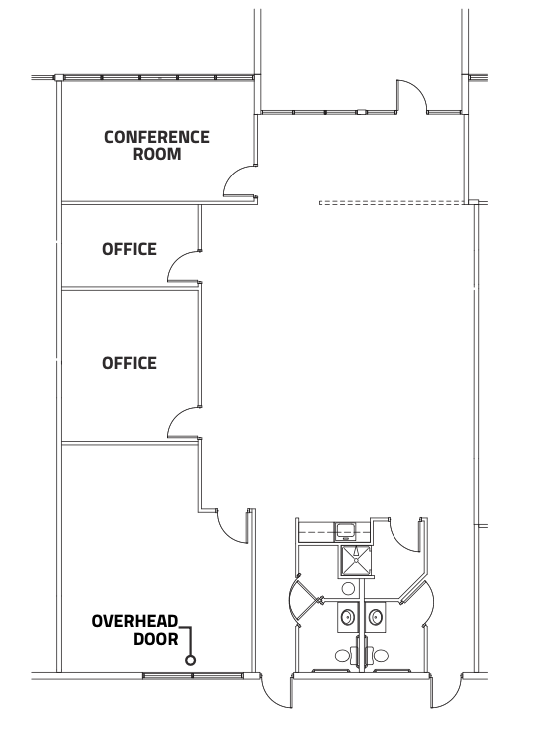 other uses), a conference room, and a flexible storage or shipping area with an overhead door